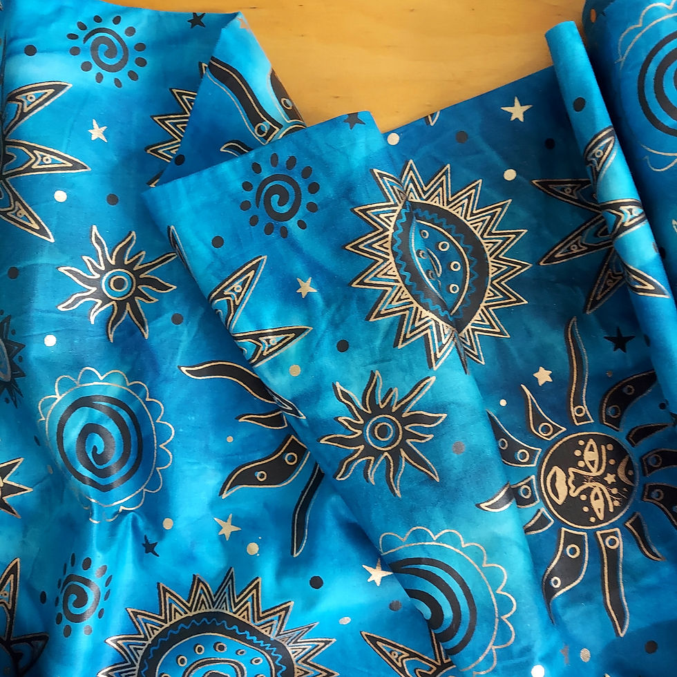 Black w/Gold on Blue Sun and Stars Odyssey OY-156 Cotton Batik Fabric
